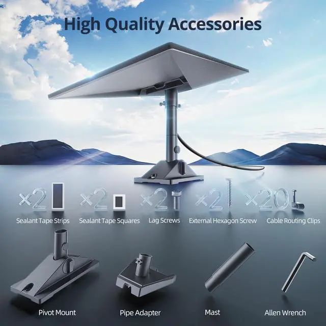 Mount Kit?: Pivot Mount, Pipe Adapter, 2x Sealant Tape Squares, 2x Sealant Tape Strips, 2x Lag Screws, 20x Cable Routing Clips, 2x External Hexagon Screw, 1X Allen Wrench, 1X Mast.