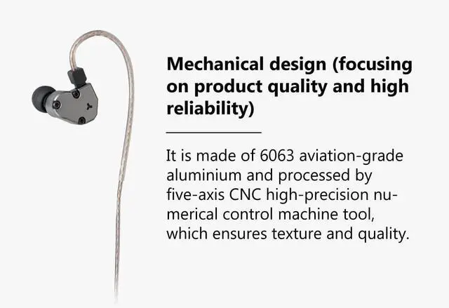 Mechanical DesignTinhifi eraphone focusingon product quality and highrelliability.TINHIFI C2 iem earphone is made of 6063 aviation-gradealuminium and processed byfive-axis CNC high-precision nu-merical control machine toolwhich ensures texture and quality.