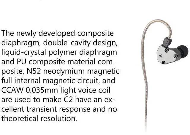 N52 Neodymium Magneticfull Internal Magnetic CircuitThe newly developed compositediaphragm , double-cavity design ,liquid-crystal polymer diaphragmand PU composite material Composite , N52 neodymium magneticfull internal magnetic circuit , andCCAW 0 . 035mm light voice coilare used to make C2 wired headphone have an excellent transient response and notheoretical resolution