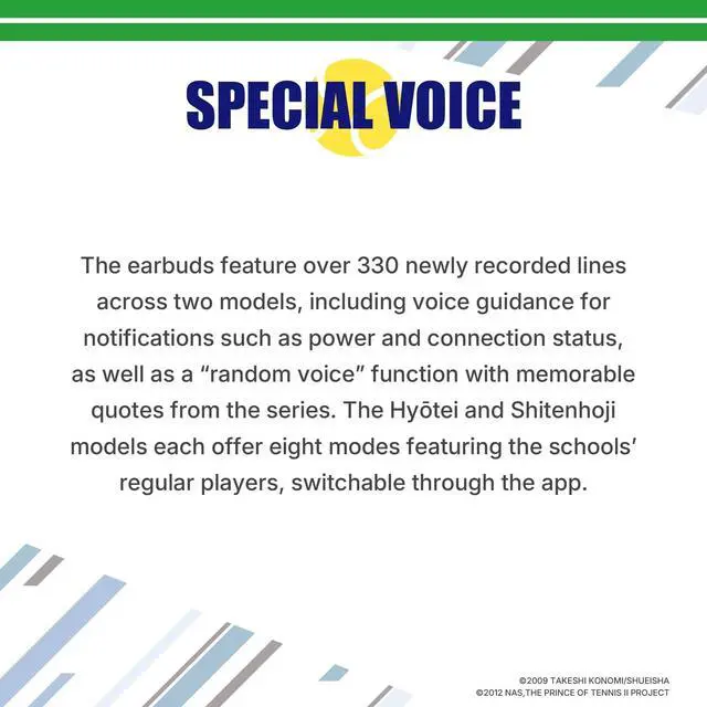 ^^ Most models offer multiple voice modes in a single device, which can be switched easily via the companion appallowing you to enjoy the personalities of multiple characters or talents from just one pair of earbuds. ^^ The sound tuning is overseen by artists or talents involved with the original anime productions, ensuring that the audio quality faithfully represents each works unique world. Select models also feature packaging with specially drawn artwork*, designed with meticulous attention to detail to reflect the world of your favorite character. *Sound tuning and special artwork may not be available for all models.