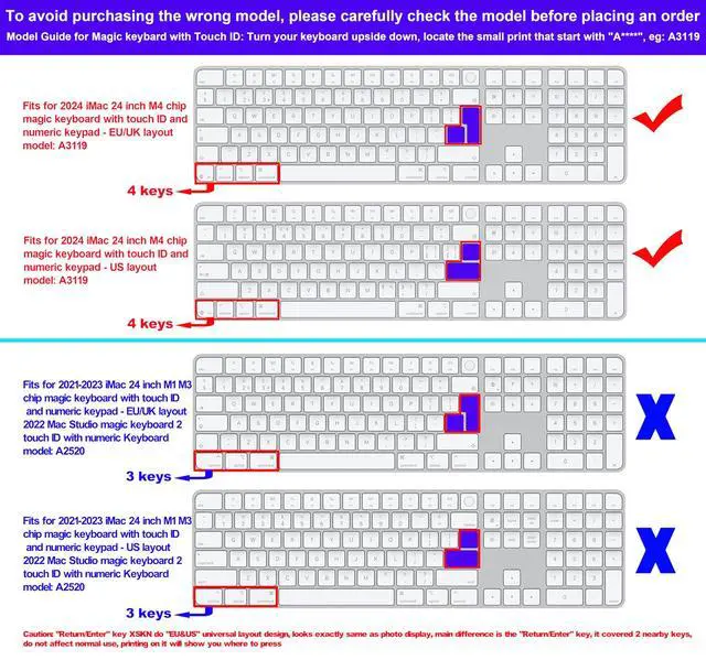 Model guide for magic keyboard: turn your keyboard upside down, locate the samll print that start with "A****", eg: A3119- Fits for 2024 US layout imac m4 magic keyboard with touch id and numeric keypad A3119- Fits for 2024 EU/UK layout imac m4 magic keyboard with touch id and numeric keypad A3119- "Return/Enter" key XSKN do "EU&US" universal layout design, looks exactly same as photo display, main difference is the "Return/Enter" key, it covered 2 nearby keys, do not affect normal use, printing on it will show you where to press- XSKN silicone keyboard cover does not support backlight shine through, the cap lock light shines through- Upper side adopted rubber coating, gives you a comfortable soft touch feeling and protect the keyboard cover from losing color- Lower side is shiny surface, make the keyboard cover fit perfectly on your keyboard without any sticker/glue- Clean by washing with soapy water, dry before use- Easy to apply- XSKN silicone keyboard skin provides full protection for the keyboard against spills, dust, liquid spill (coffee/beer/milk) dirty fingers and other contaminantsNOT FITS FOR MAGIC KEYBOARD- NOT FITS FOR Apple wireless keyboard, model: A1314- NOT FITS FOR Apple iMac keyboard with numeric keypad wired, model: A1243- NOT FITS FOR Apple iMac magic keyboard with numeric keypad, model: A1843- NOT FITS FOR Apple iMac magic keyboard with numeric keypad, model: A2520Special