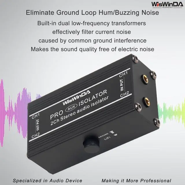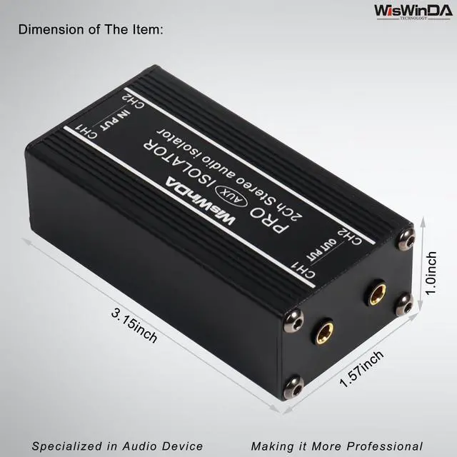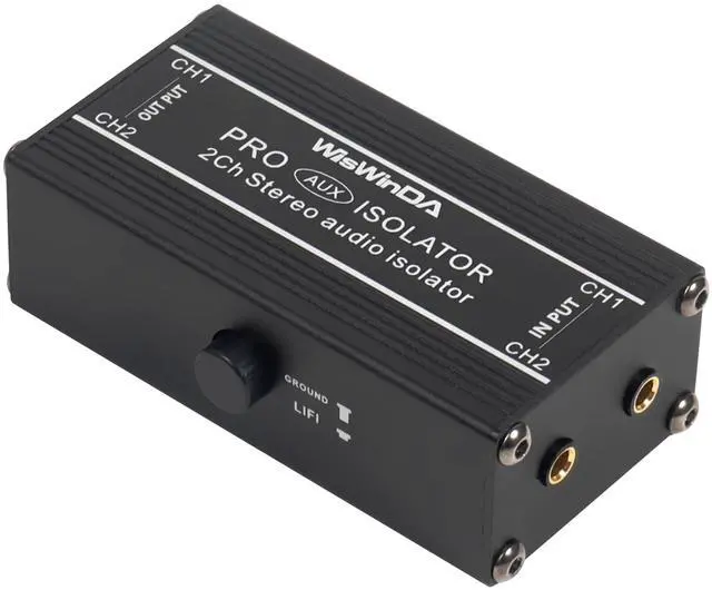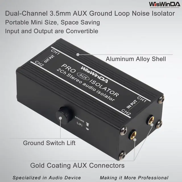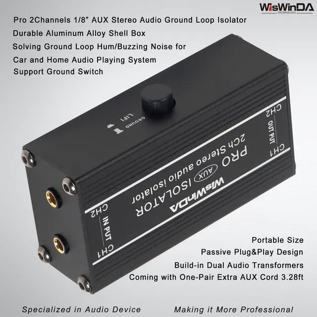1. WisWinDa 2Channels Pro 3.5 mm Aux noise filter box aluminum alloy ground loop isolator for eliminating audio ground loop hum/buzzing noise with ground switch coming with One Pair AUX Cords. ^^ 2. Two channels could be used separately, it's two-in-one plug&play design, easy and convenient in using. ^^ 3. Build-in quality audio isolators, no lossing bass for enjoy a better sound. ^^ 4. Durable aluminum alloy box design makes it very sturdy while using in different situations. ^^ 5. The item coming with one pair AUX cord, Length 2.68 ft.