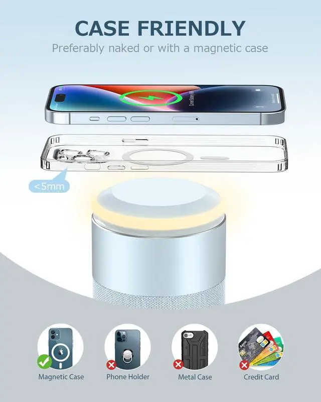 Magnetic Phone Stand]: Charging plate is designed with a convex surface, with a new version of the N54 magnet, which can firmly clamp large-size iPhone models without falling off, and fit tightly. You can easily place your phone horizontally or vertically. The phone will not shake during use. ^^ [Energy-efficient