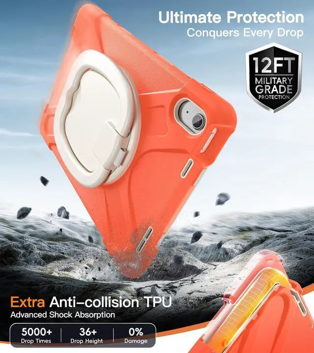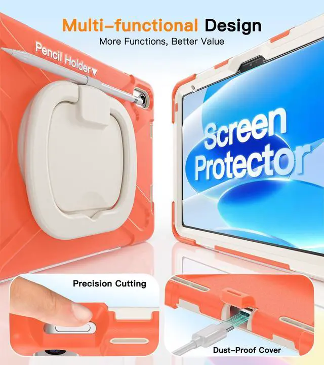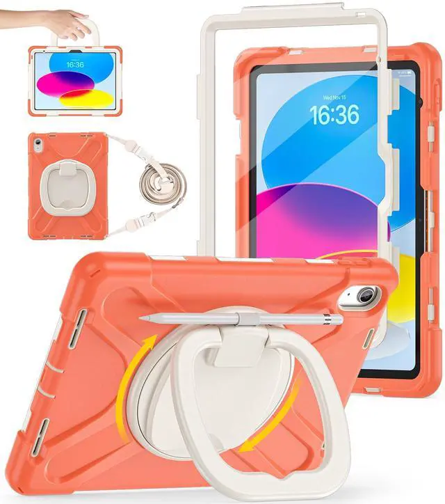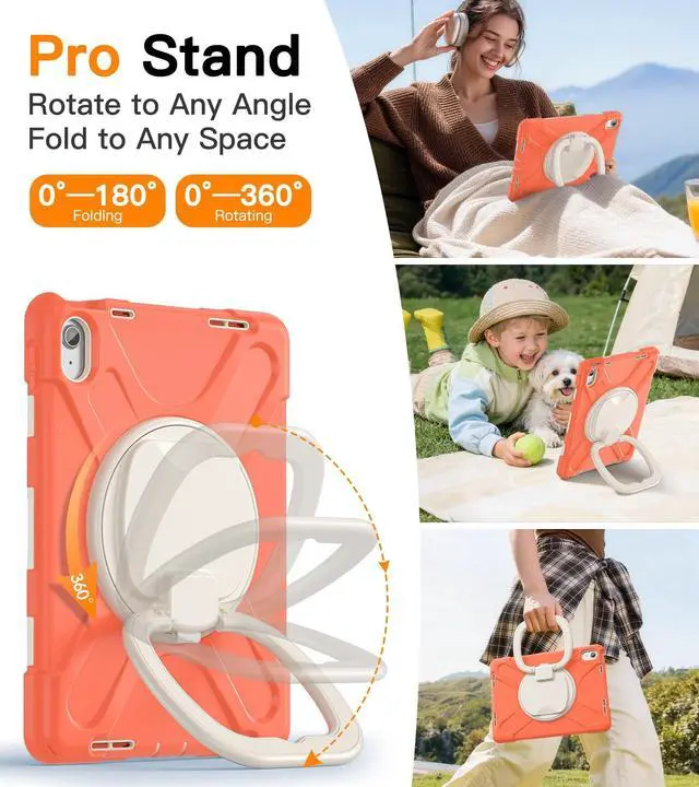 Gen (2022): Engineered exclusively for (A16) 11th Gen 11"(A3354/A3355/A3356) and iPad 10th Gen 10.9" (A2757/A2777/A2696). Perfect case for students, professionals, and creative users who demand perfect model compatibility. Confirm your iPad generation before purchase - not compatible with other models. (Apple Pencil is not included) ^^ Built for demanding environments, this military-grade iPad case offers ultimate drop and dust protection. The rugged silicone shell with TPU shock-absorbing strips and a hard PC frame provides full-body defense. Reinforced corners and raised edges safeguard against accidental drops on playgrounds, hiking trails, or in a busy family vehicle. The high-visibility coral orange color prevents loss and is easy to spot in grass, sand. Ideal for outdoor enthusiasts, parents, children, adventure guides. ^^ 360 Rotating & 180 Foldable Stand -
