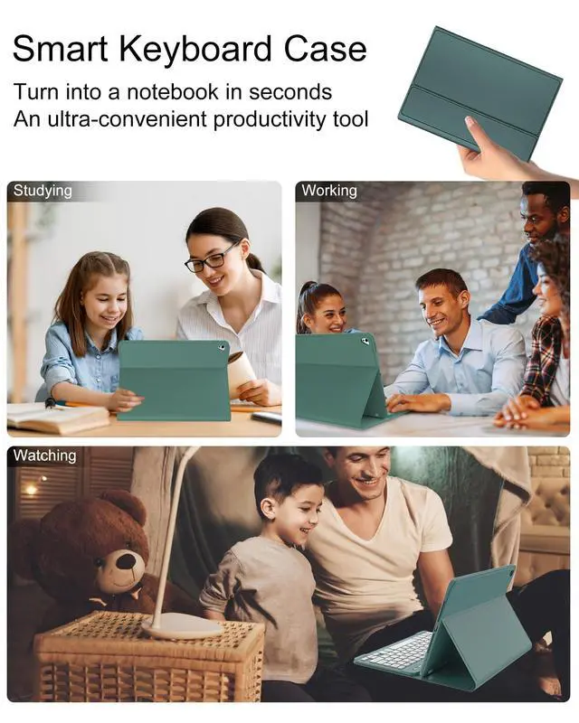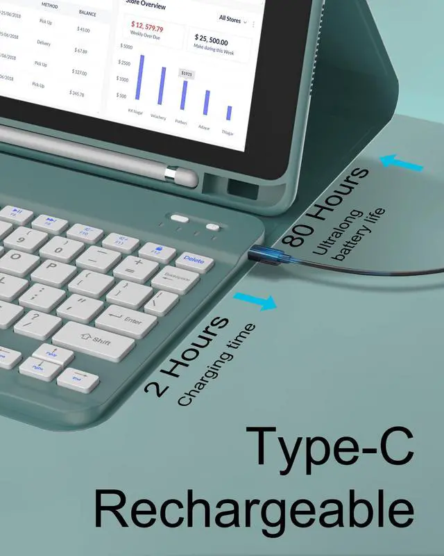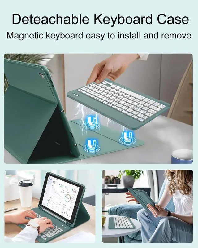 Lista de embalaje: 1 *Funda protectora para iPad de 9/8/7 generacion de 10, 2 pulgadas. 1 * teclado bluetooth inalambrico desmontable1 * cable de carga tipo C. 1 * Manual de usuario