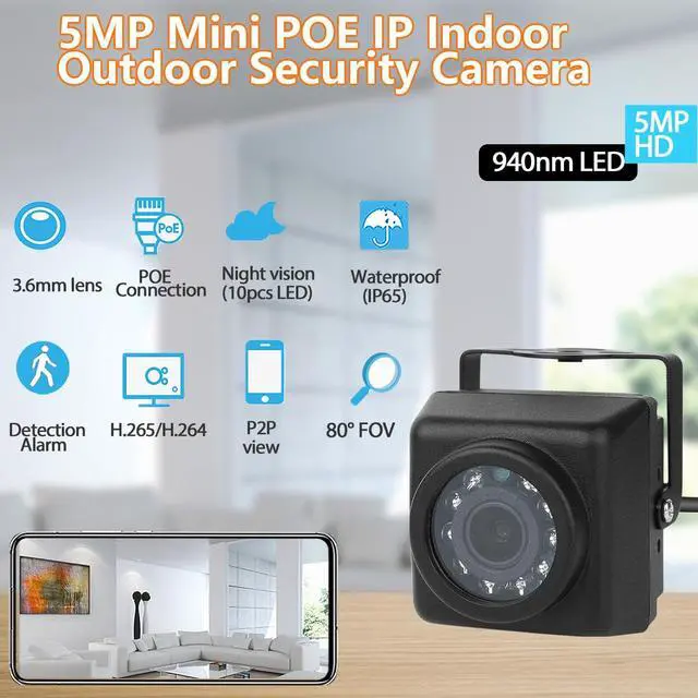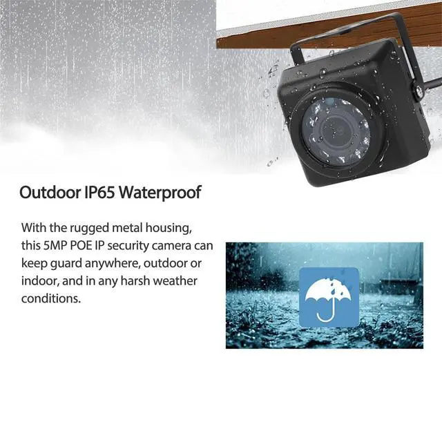 5MP HD ResolutionThis IP camera uses a high-resolution 5.0 -megapixel 1/3-inch CMOS sensor with 25 frames per second, allowing you to see clearer images and details. ^^ Night Vision & IP65 Waterproof The camera built-in 10 IR LEDs, the 940nm infrared light board provides invisible night vision and can capture a clear picture in a completely dark environment. The camera is IP65 waterproof, suitable for indoor and outdoor installation, and stable operation even in bad weather conditions. ^^ Support POE and DCBuilt-in POE template, support 48V 802.3 af POE function, (Power over Ethernet), reduce wiring trouble.