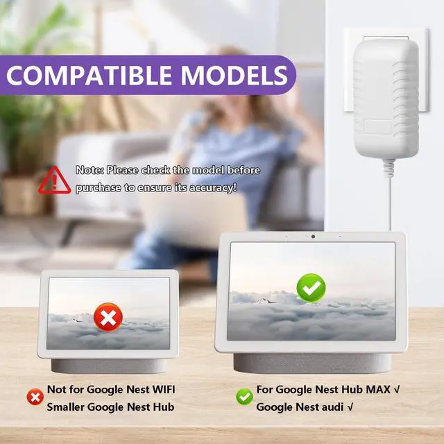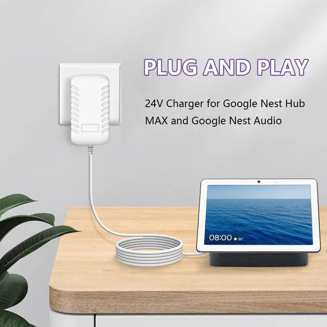 Perfect Compatibility & Precise FitThe adapter is designed for Google Nest Hub MAX and Google Nest Audio. Not compatible with Google Nest Mini, Google Nest Wifi, Google Home or the smaller version of Google Nest Hub. ^^ Stable Power Output & Extended CableProvides a consistent 24V 1.25A (30W) output for your device's operation. The 10FT long cable offers flexible placement, allowing you to conveniently position your smart display or speaker. ^^ Built-in Safety ProtectionsConstructed with materials designed for durability, this power supply includes safeguards such as protection against over-voltage, over-current and short-circuit, helping to protect your connected devices.