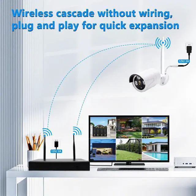 Wire-Free 3MP/5MP HD KitThis complete surveillance system includes four bullet cameras and a 10-channel NVR that delivers crystal-clear 3MP/5MP resolution. Easily expand your coverage to up to 10 cameras for comprehensive property protection ^^ Easy Install, Power Plug Needed & Wireless Cascade TechnologyWireless video security system supports easy DIY installation with innovative wireless cascade technology that cuts complex wiring. Wireless refers to camera-NVR wireless linkboth need power plugs for true Plug & Play. Pre-paired at the factory, cameras and NVR auto-connect within minutes of powering on.