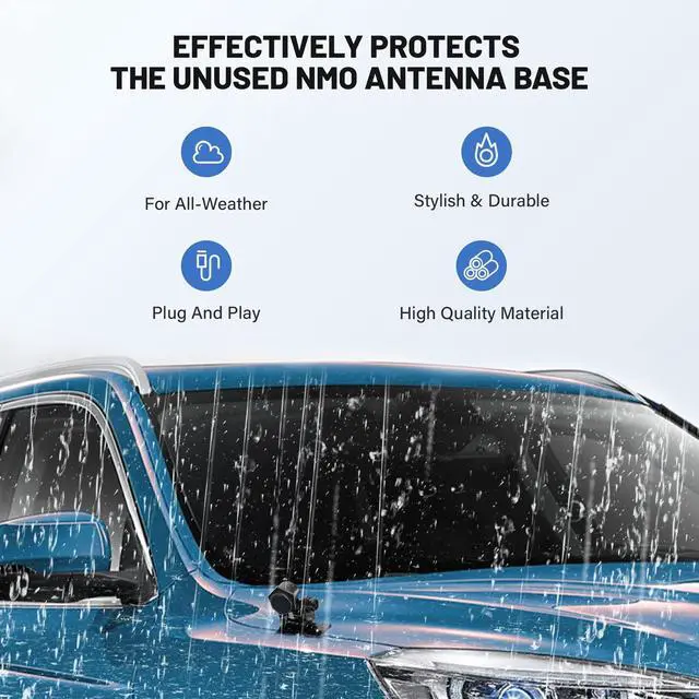 Antenna Base Cap: Effectively protects the unused NMO antenna in all environments; The design of O ring seal in the base to keep water out, especially removing the antenna when washing your car, the NMO rain cap protect the NMO base to prevent rust ^^