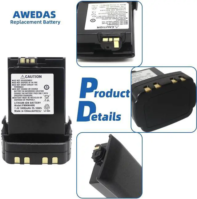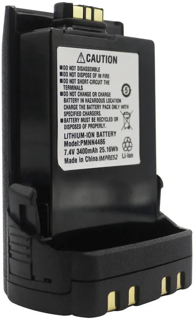 Wide CompatibilityFully Compatible for APX6000 APX7000 APX8000 SRX2200 and more models. ^^ Product SpecificationsThis PMNN4486 PMNN4486A PMNN4485A PMNN4485 NNTN7038 NNTN7038A NNTN7038B replacement battery has a capacity of 3400mAh, Li-ion Polymer material, 7.4V Voltage and With impres 2 function. ^^ About Our BatteryThe latest advanced technology provides additional stable battery life and battery health. Our batteries are all new and the size is the same as your original battery. The high-quality designed pmnn4486 battery case, which provides strong protection to the battery and smart chip. Over temperature protection, over charging protection, over load protection, and short circuit protection were all provided by built-in A-class battery cells and ic chips.