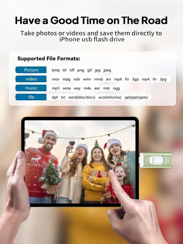 (Note: For iPhone/iPad No App Required; For Android only Needs OTG Enabled, No Extra App. ) ^^ Blazing Fast Transfers AnywhereEquipped with upgraded high-speed chips, this portable phone external storage flash drive lets you transfer massive files in secondsno WiFi, no data cables needed. Save time when sharing photos or moving large video projects, whether youre traveling, working, or creating content. ^^ Universal Compatibility with Dual InterfacesFeaturing USB-C, USB-L, USB ports adapter, this Compatibility iPhone photo storage stick connects seamlessly with iPhone/iPad devices, Android OTG phones, laptops, and tablets. No iCloud fees, no internet requiredjust plug in and move files freely between your phone, computer, and other devices. ^^ Easy to Backup, Enjoy AnywhereEasy to use, plug and play. With just one click, you can quickly back up videos, photos, contacts, and documents, eliminating tedious copying and pasting. Simply plug in your iPhone, iPad, or Android phone. Files are saved directly to the iPhone storage, freeing up valuable space. You can also share files directly from the photo stick for iphone to social media with one click, instantly sharing moments with friends and family.
