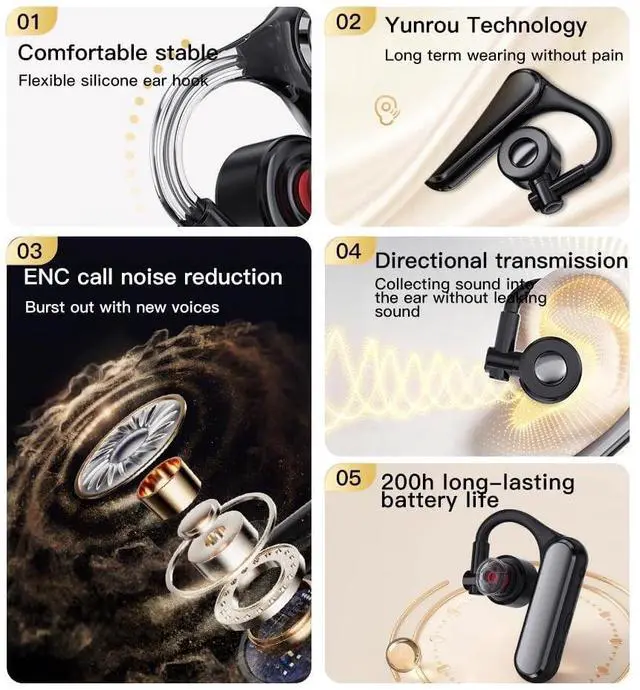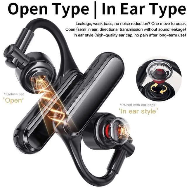 Bluetooth 5.4: Supports connecting to two mobile phones simultaneously for seamless switching. Features upgraded Bluetooth 5.4 for stable connection and low-latency transmission ^^ Open-Ear Air Conduction & All-Day Comfort: Built-in 16mm large driver with open-ear air conduction design helps you stay aware of surroundings while driving, and reduces ear fatigue during long work or travel ^^ Long Battery Life & Anti-Accidental Touch Controls: Delivers up to 30 hours of playtime and 200 hours of standby time. Easy-access button controls support volume, track change, and hands-free calls without accidental operation ^^ ENC Noise Canceling Mic & Detachable Ear Caps: Equipped with ENC microphone to filter out background noise for crystal-clear calls. Detachable in-ear caps provide better privacy and prevent sound leakage ^^ Versatile