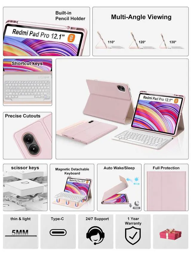 Turn your xiaomi tablet redmi pad pro into a laptop in one second, perfect for studying, working, writing, painting, reading or watching videos ^^ Precise Cutout & Full Body ProtectionThis 12.1 inch case with keyboard for xiaomi tablet redmi pad pro is made of good quality PU leather. Soft, smooth and it gives a luxurious feeling. The interior built-in protective shell is made of high-quality flexible TPU with honeycomb grid design, better for heat release and anti-skid, effectively extending life of your tablet. Precise cutout allows full access to all ports, sensors, speaker, microphone and camera ^^ Stable Bluetooth Connection & Long Battery LifeConvenient and fast Bluetooth connection allows you to use the keyboard anywhere, anytime.
