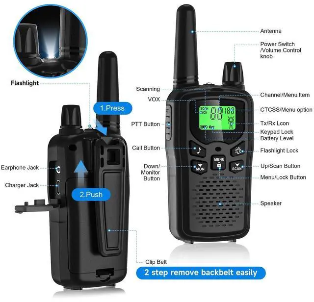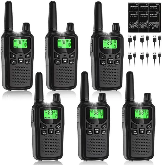 Compact, drop-proof, and rainproof design with crystal-clear audio. ^^ SIMPLE OPERATION & AVOID USING PHONES2 way radios can be used in commercial occasions or family outdoor activitiesperfect for construction crews, outdoor adventures (hiking, camping, driving), hotels, retail stores, schools, churches, and emergency teams. Two or more FRS devices can communicate with each other as long as their Channels and CTCSS/DCS settings are the same. ^^ WHAT YOU GETVOX & PTT) This woki toki provide interphone x 6, 1200 mAh lithium battery x 6, Charging cable x 6, belt clip x 6, and user manual x 1. LED flashlight bonus for darkness LCD backlit. Adjustable VOX from 0 to 3 level; no need to press the PTT key; walkie-talkies enables workers to talk directly while working.