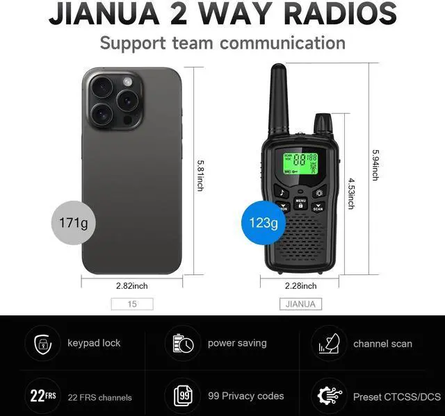 2) CTCSS/DCS selection: Press MENU twice, then press the up or down key to select one group from Group 99 of CTCSS/DCS, and press PTT to confirm. ^^ MONEY-SAVING & CHARGEABLE TYPE-C BATTERY Under normal circumstances, walkie talkie can be used for 8-96 hours with a full charge, and up to 8-12 hours with continuous use. The actual time depends on the frequency of use; 1 hours to fully charge a battery from 0 capacity. Upgraded USB-C cable bonus, optimize mini USB interface makes sturdier. Economical and money-saving than battery models. ^^ LONG RANGE & SWITCH CHANNELS AVIOD INTERFERENCE The distance can reach 5 miles in open areas such as rural areas, suburbs or seaside, etc. where there is no shelter. If in cities or towns or forested area, walkie talkies can reach 0.6 - 1.2 miles in most cases. The actual distance Depends on the obstruction of the current environment. If you encounter radio interference, change another channel can be solved. ^^ EASY TO CARRY & HAND FREEpocket size and the light weight is a huge advantage for JIANUA portable frs two-way radios; smaller and lighter than a cellphone; wrap-around back clip can be quickly removed and installed; clips the radios to belt for hands free operations.
