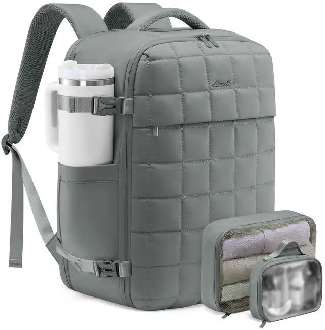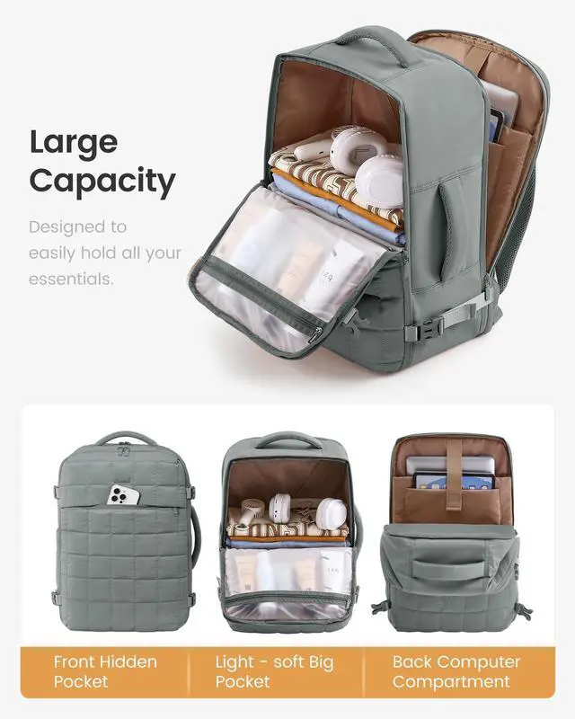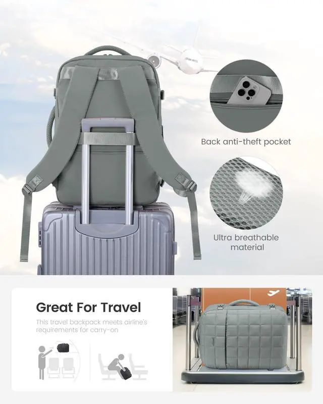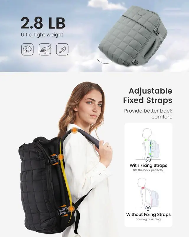 The carry on backpack for airplane travel also meets the carry on requirements of airlines. The top and sides of the carry on bag are equipped with two padded handles, providing multiple ways of carrying and can also be secured to the luggage handle for easy boarding ^^ Lightweight & BreathableThe stylish puffy weekender travel backpacks for women are made of padded cotton fabric, featuring waterproof, lightweight, comfortable, and soft. The shoulder straps are made of breathable mesh material, which can reduce shoulder pressure and travel burden. The overall style is simple and practical ^^ Widely UsedOvernight bag for women can be used in various scenarios and practical ways, including business backpacks, luggage bags, shoulder bags, and travel bags.