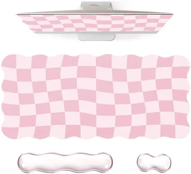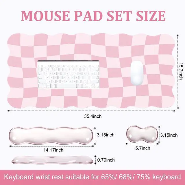 3Pcs Scalloped Desk Mat Set- Groovy gaming mouse pad with wrist rest set package includes large pink checkered desk mouse pad, gel clear pink keyboard wrist pad, gel clear pink mouse wrist rest, feature a scalloped edge design, making it more stylish. The minimalist pink desk pad mat with exquisite stitched edges for wear resistance and durability, adding a touch of elegance to your desktop ^^ Gel Wrist Rest for Keyboard and Mouse- Silicone gel material of this wrist rest set provides a comfortable and supportive surface for your wrists while typing or using a mouse.