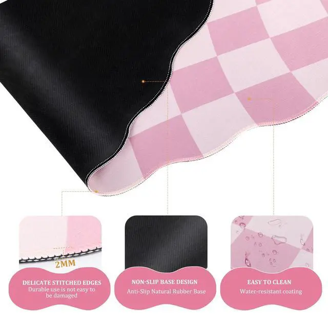 Clean: Pink large desk pad, silicone gel wrist rest for keyboard and mouse equipped with a waterproof coating, resist liquid spills. The pink checkered computer mat for desk is washable: hand wash easily cleaned with a wet cloth or washing machine. Water resistant and heat resistant material makes this gaming mouse pad easy to clean ^^ Exquisite Gift-The pink groovy checkered desktop mat provides ample space for your mouse, gaming keyboard, and other desktop essentials. Its large size keeps your workspace neat and organized, perfect for both gaming and office use. The geometric pink desk matt for desktop is exquisite and durable, making it an excellent gift for family, friends and oneself