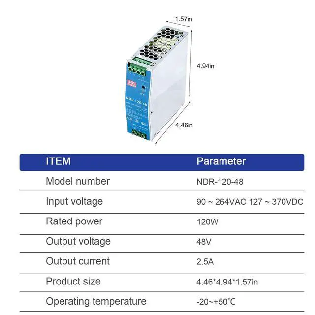 The MeanWell NDR-120-48 is a reliable and efficient DIN Rail power supply designed for industrial applications. It delivers a stable 48V DC output at 2.5A, providing 120W of power. Its slim design makes it ideal for installations where space is limited. The NDR-120-48 is certified to UL508 and TUV EN62368-1 safety standards, ensuring safe and reliable operation. It features built-in protection against short circuits, overloads, and overvoltage. Choose the MeanWell NDR-120-48 for a dependable and efficient power solution for your industrial needs.