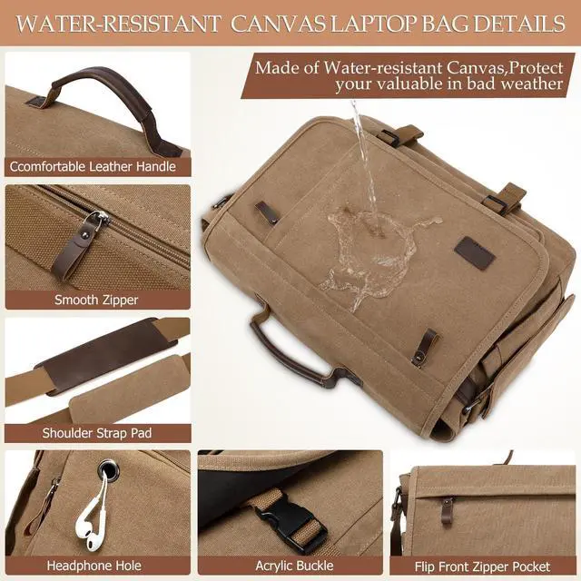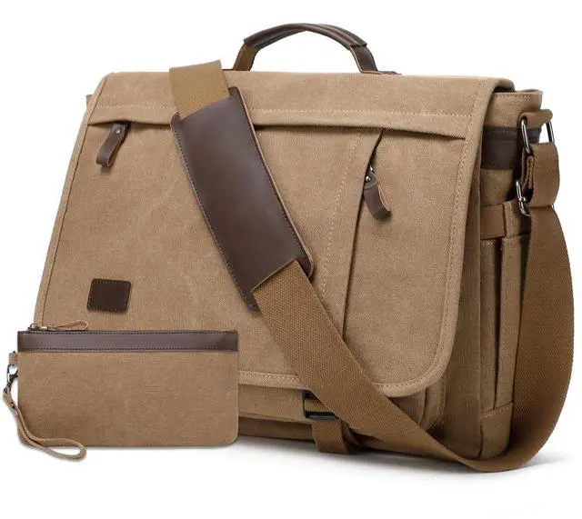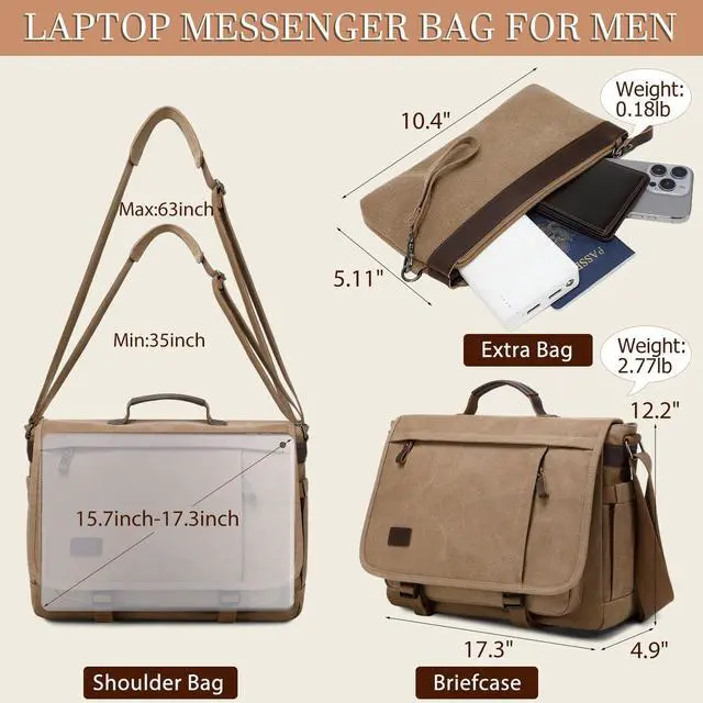 [ 2 PCS RETRO MEN'S MESSENGER BAG ] Office work bag for men is made of water repellent canvas with PU brown leather. Disordered wrinkles and scratches on surface create a vintage and wild looking. Comes with a small bag for pens, keys, mobile phone and cash, perfect for people in college, business and work. ^^ [ 17.3" LAPTOP BAG DIMENSIONS ] The external dimension of this briefcase is 17.3"L * 4.7"W * 10.2"H ( 2.77 pounds). Extra bag is 7.8"L * 4.8"H ( 0.18 pounds). This messenger bag inner padded laptop sleeve fits up to 12.9 inch- 17.3 inch laptop/tablet/computer.