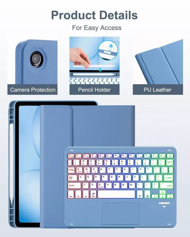 Applicable ModelOnly compatible with Samsung Galaxy Tab A11Plus/A9 Plus 11.0 inch 2025/2023 (SM-X230 SM-X235 SM-X236B/SM-X210 SM-X215 SM-X216 SM-X218), please check the model number SM-X*** in the "Settings" of the tablet before purchasing. This product cannot be used with Other models are not compatible. Tablet and stylus not included with this product ^^ 7-Color Rainbow Backlight, Multi-Function KeysThe keyboard has 7-color rainbow backlight, which can be switched between rainbow backlight mode and breathing light mode, providing you with an excellent typing experience in a dark environment. The first row of the keyboard is equipped with shortcut function keys, which can quickly realize functions such as select all, copy, paste, pause/play, etc ^^ Rechargeable, Detachable KeyboardThis keyboard has a built-in rechargable battery, you can charge it via the USB-C charging cable for 2-3 hours, it can work for about 5 hours when the backlight is on, and about 80 hours when the backlight is off.