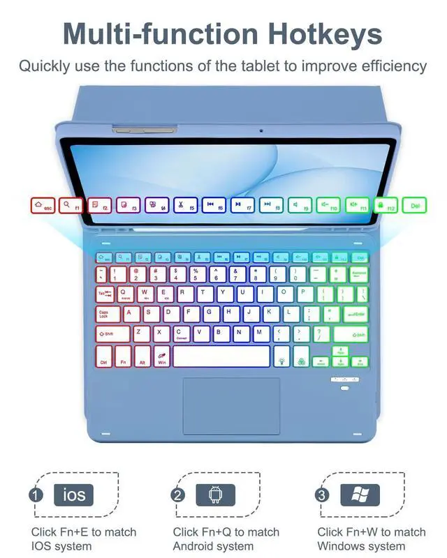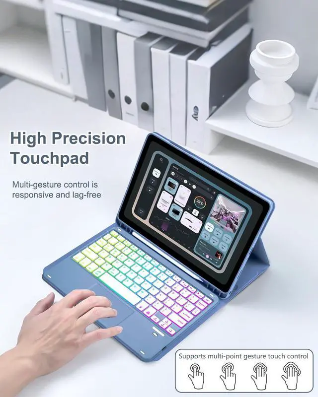 The keyboard can be detached when not needed, making it convenient for you to carry your tablet ^^ Smart Touchpad, Supports Multi-touch The keyboard built-in smart touchpad, which has multi-touch function and supports 1 2 3 4 fingers Gestures. 1-fingers swipe can move the cursor, click to select the target, 2-fingers swipe can scroll the page and zoom the picture, 3-fingers swipe left and right can switch applications, and 4-fingers click can take a screenshot ^^ Magnetic Adsorption, Multi-angle AdjustmentThis keyboard cover has built-in magnets with strong adsorption function, which can firmly adsorb the keyboard to prevent it from falling.
