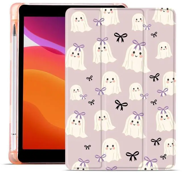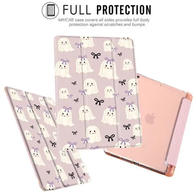 MAYCARI Halloween Case for iPad 10.2 inch 2021/2020/2019 with Pencil Holder, Original Cute Ghosts Bows iPad 9th/8th/7th Generation Soft TPU Back Protective Cover Shell, Auto Sleep/Wake Slim Shell