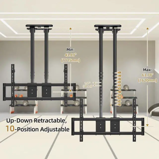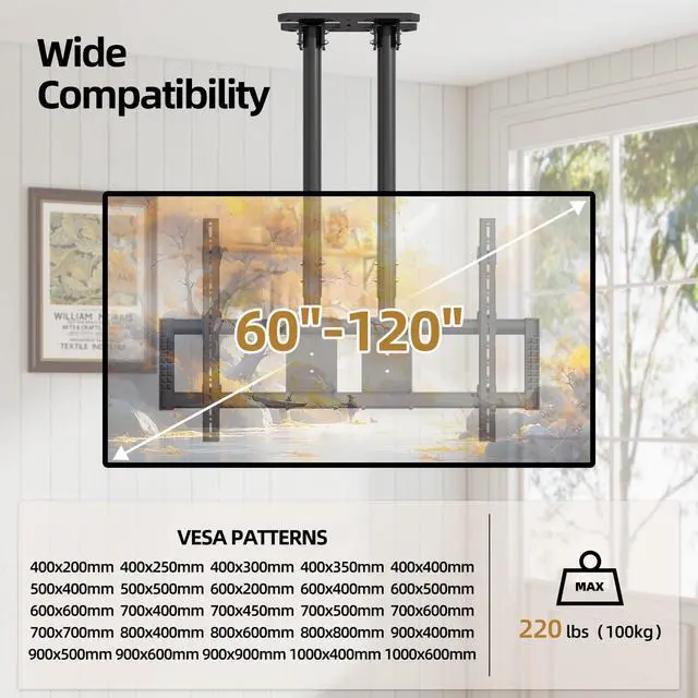 WIDE COMPATIBILITY: The Universal TV ceiling mount is specially designed to fit almost flat 60-120" TVs hold up to 220 lbs100kg, This ceiling TV bracket fits TV size 60 62 65 70 75 77 80 83 85 86 90 98 100 105 110 115 116 120 inches etc with VESA patterns 400x200 to 1000x600mm, VESA =HorizontalVertical, VESA Patterns include400x200mm 400x250mm 400x300mm 400x350mm 400x400mm 500x400mm 500x500mm 600x200mm 600x400mm 600x500mm 600x600mm 700x400mm 700x450mm 700x500mm 800x400mm 800x600mm 800x800mm 900x400mm 900x500mm 900x600mm 900x900mm 1000x400mm 1000x600mm etc ^^ MULTI LEVEL HEIGHT ADJUSTMENT- This ceiling mount tv bracket comes with 10-speed height adjustment, 1.96" (50mm) per speed to fit various viewing preferences allowing the screen display to extend 43.89" (1115mm) to 63.77" (1620mm) from ceiling to center of tv plate for the perfect viewing angle ^^