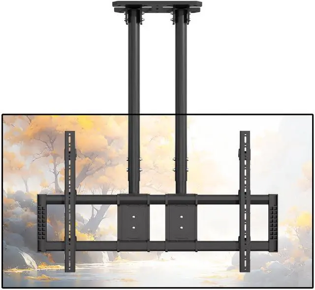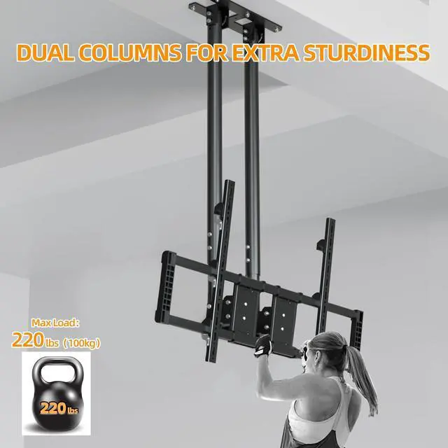 & SAVING SPACE: This ceiling mount tv bracket has a unique double column structure, which allows the hanger to bear a maximum weight of 220 lbs (100kg) and is stable without shaking, making it suitable for outdoor use without fear of strong winds. These features make this hanging tv mount very suitable for installation in hotels, restaurants, cafes, gyms, grocery stores, airports, shopping centers, terrace churches, basements, attics, outdoor terraces, above fireplaces and your home, among many other scenarios you can imagine ^^ EASY INSTALLATION & EXCELLENT CUSTOMER SERVICE: Installation of ceiling tv mount is very easy because of the detailed instruction, mounting hardware and drilling template are included; Of course, you can also watch the installation video on the front page, Please