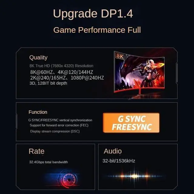 Technology: Enjoy vibrant, true-to-life colors with HDR10 support. Featuring Display Stream Compression (DSC) 1.2, this cable delivers visually lossless transmission of ultra-high-resolution content like 8K HDR, providing an immersive viewing experience without any compromise on quality. ^^