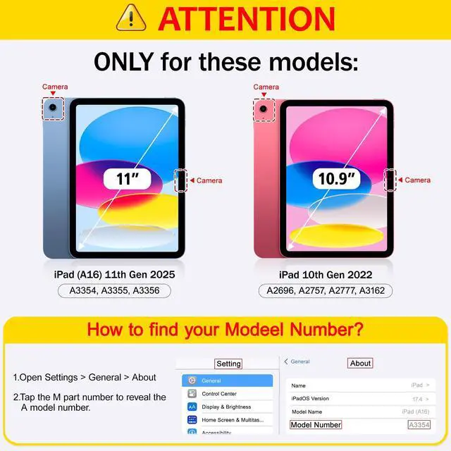 Model: A2757 A2777 A2696. NOT compatible with any other iPad models, please kindly check the model number Axxxx on the bottom of Tablet before purchasing.