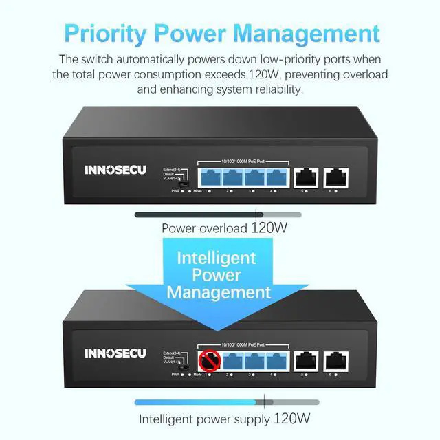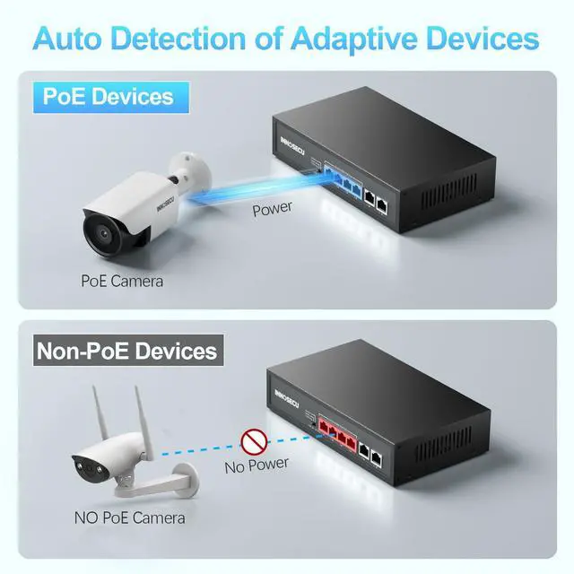^^ Auto PD Detection: Intelligently identifies connected PoE devices (PDs) and only supplies power to IEEE-compliant terminals, preventing potential damage to non-PoE equipment.