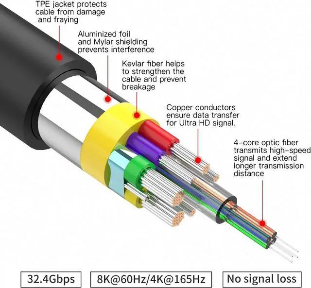 Fiber Optic DP DisplayPort 1.4 Cable supports video resolutions up to 8K 7680x4320 at 60Hz (4K 144Hz) and transmits HD audio and video from computer to display, Ideal for video streaming, gaming, or extending a workstation.