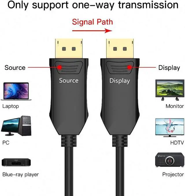 Optic Connectors: More durable for use. Ready to install and use; plug and play. Connection without direction, you can select any end to connect to your DisplayPort source or Displays. Display Port Cable 1.4 Ordinary Fiber Optic Cord Cable, supports two