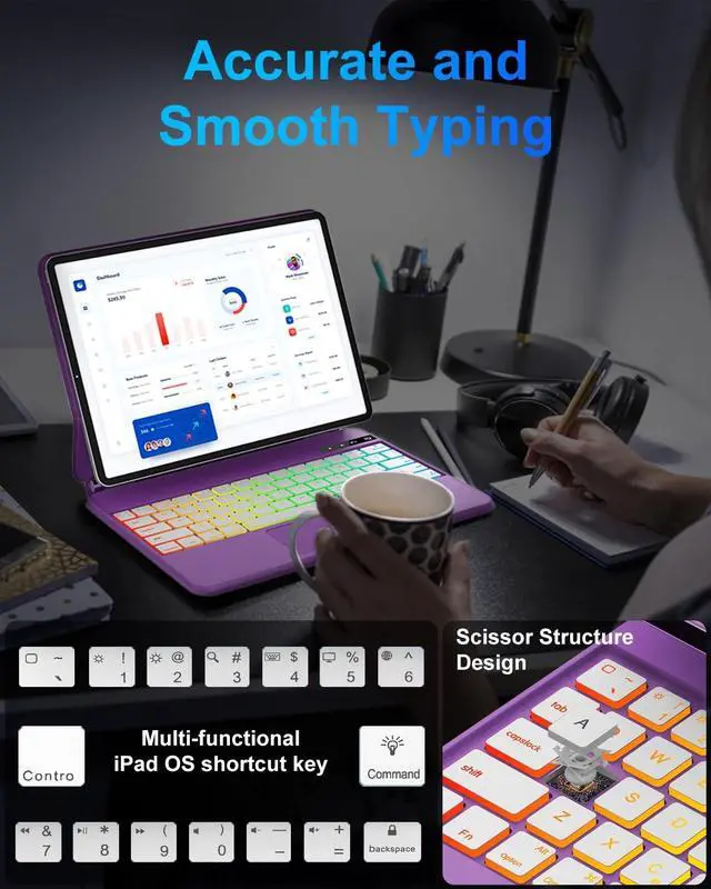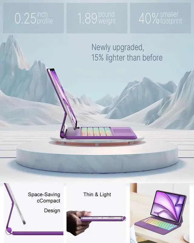 Power Display Screen: To let you know the remaining power of your keyboard at any time. A reliable magnetic closure ensures the safety and security of your iPad, while also providing a secure spot for your Pencil. Innovative and intuitive, the floating cantilever design of the keyboard case allows for effortless adjustment to your preferred viewing angle. Auto Sleep /