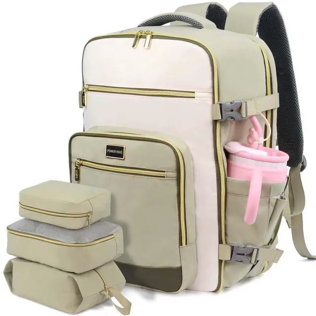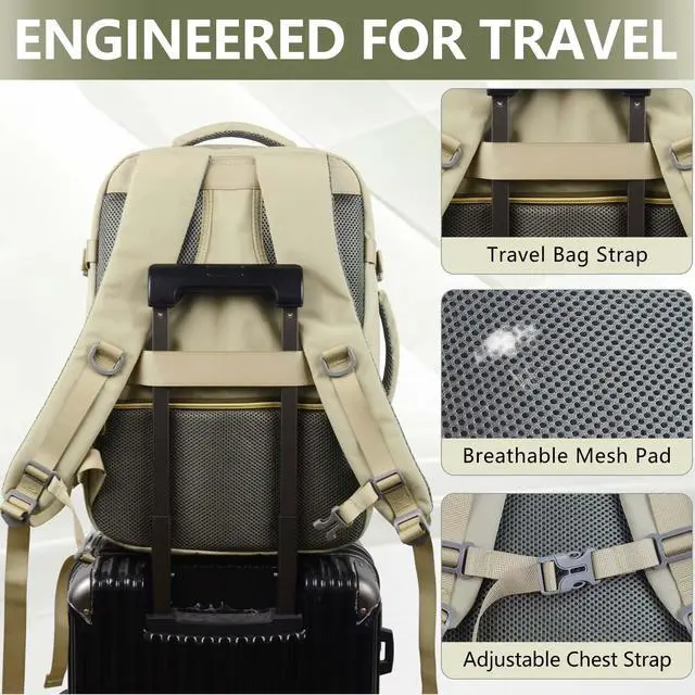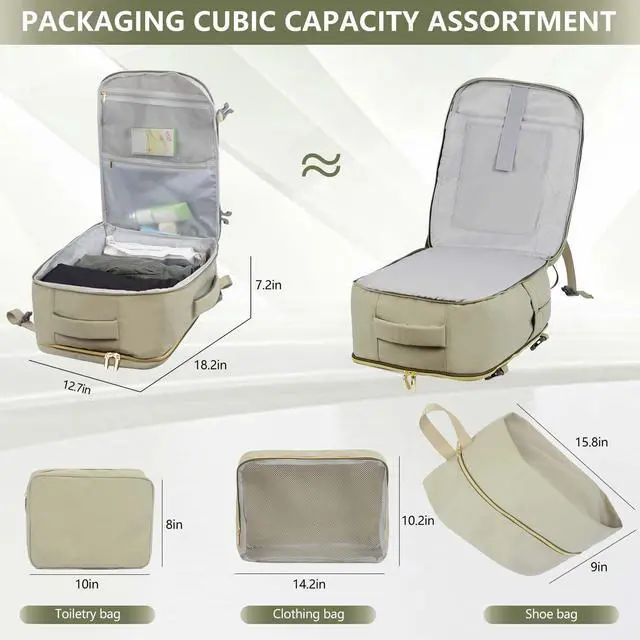 ^^ With 3 Extra Storage Bags & Wet PocketsThe carry on backpack has a built-in wet compartment pocket and 3 storage bags ( 1 tolietry bag, 1 net bag, 1 shoe bag). They are great for storing wet clothes, towels and toiletries when packing for a trip, It can not only achieve dry-wet separation but also prevent moisture from affecting other items. ^^ Practical & ComfortableThis carry-on backpack features high-quality nylon fabric thats tearproof, water-resistant and abrasion-resistant for long-lasting use. The back and the adjustable shoulder strap are both equipped with breathable sponge mesh pads, which not only reduce the pressure of carrying but also enhance ventilation and air permeability.