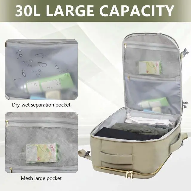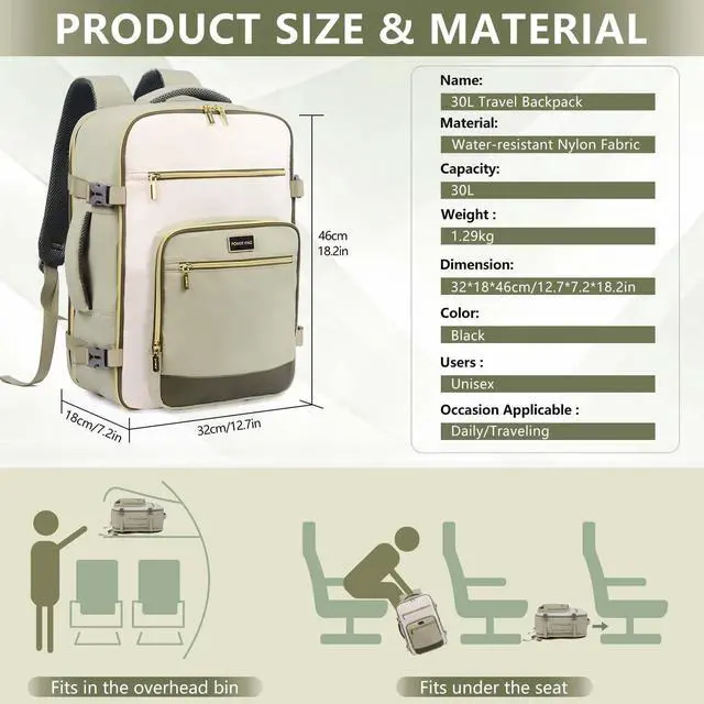 Large Capacity Multi-pocket BackpackThis extra large travel backpack with a 30L capacity, 2 main compartments and a lot of pockets. Spacious enough to hold 5-8 garments, books, a laptop, shoes and other daily essentials. It is very suitable for men, women and weekend travelers. ^^ Flight Approved Laptop BackpackDimensions 18.2 * 12.7 * 7.2 in. Light weight 1.29K g ( 2.8 lb). 180-Degree Zipper Closure for swift security check passage. This carry-on backpack fits perfectly under the seat or in the overhead bin. It is very easy to carry on most flights.