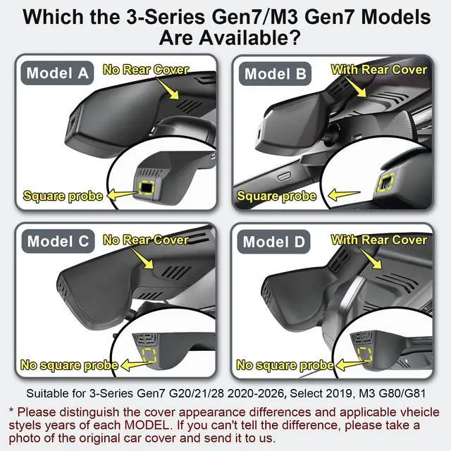 Difference of Model A & B & C& DThe model A, model B, model C, model D match the same vehicle year and must be distinguished by the vehicle sensor cover. The second picture is a comparison of the 4 models. ^^ Custom fit for BMW 3-Series Gen7 G20/21/28; M3 G80/G81Mangoal Front 4K and Rear 1080P dash cam can fit perfectly behind the rear view mirror like original. No messy wiring exposed, no complicated rewire at all. Perfectly intergrated with BMW 3-Series Gen7 G20 G21 G28 2020 2021 2022 2023 2024 Select 2019 M3 G80 G81 (Model C) ^^ Front 4K and Rear 1080POur dual dash cam which records video of up to Ultra HD 4K (3840x2160) +FHD 1080P resolutions.
