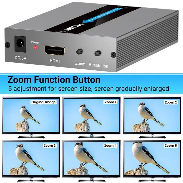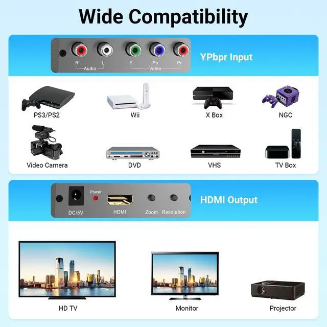 Note: 1. The Component + R/L jacks must be correctly connected. 2. Not Compatible with 240P retro games input. 3. Does not support 4K HDMI resolution. This Component to HDMI converter is designed to seamlessly connnect your older Component devices to modern HDMI-equipped displays, and delivers superior audio and video quality without compromising on performance. What sets our converter apart is its built-in scaling function, which intelligently upscales your Component video signal into multiple resolutions of HDMI signals.