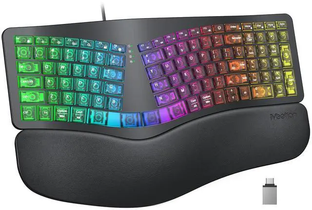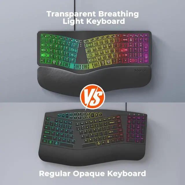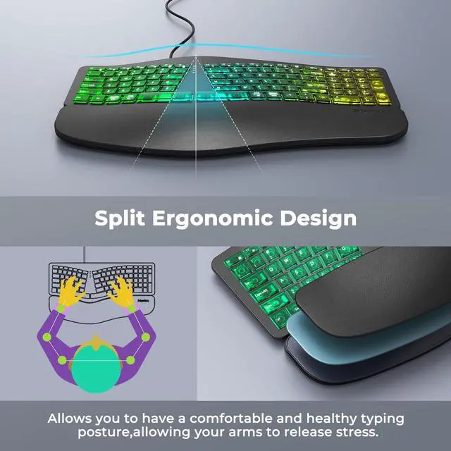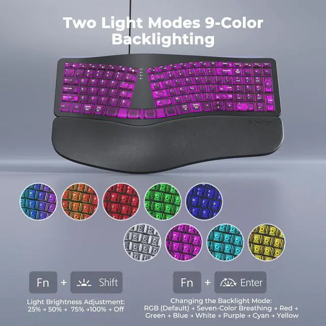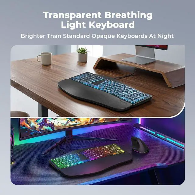 TRANSLUCENT ERGONOMIC DESIGNEncased in a sleek, semi-transparent shell that offers a glimpse into the keyboard's inner mechanics, this device combines modern aesthetics with advanced ergonomics. Its split, curved layout mirrors the natural resting position of your hands, encouraging a more relaxed shoulder and elbow alignment. By reducing muscle strain and minimizing wrist deviation, this design is ideal for professionals and writers who spend extended hours at the keyboard. ^^ 7-COLOR STATIC BACKLIGHTINGPersonalize your workspace with 7 vivid, single-color backlight options, ranging from soothing blues to energetic reds. Unlike flashing or cycling effects, these steady hues provide consistent illumination that enhances visibility in low-light conditions without distraction.