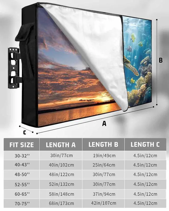 Outdoor TV Cover Size Chart30-32in /30x19x 4.5 in32 in smart tv40-43in /40x25x 4.5 in43 inch smart tv48-50in /48x30x 4.5 in50 inch tv52-55in /52x30x 4.5 in55 inch tv60-65in /58x37x 4.5 in65 inch tv70-75in /68x42x 4.5 in75 inch tvOutdoor TV Protector DesignFull coverage design avoids damage from the vivid elements, making your outside television always look like new. Warm TipsPlease measure the size of your TV accurately before purchasing a TV cover. Store the remote in the cover pocket. When youre ready to switch off and head indoors, always remember to place the remote inside its pocket on your outdoor TV cover.