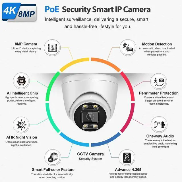 Video Compression Format--- Package: 1 x 4K (8-Megapixel) Dome Audio Camera White 1 x RJ45 network port waterproof sleeve 1 x Mounting screw Kit