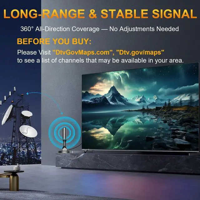 ^^ &: Featuring versatile placement, the digital TV antenna for smart tv indoor includes a powerful magnetic base for effortless installation on metal surfaces. Securely attach it to the TV stand, window frame, or hide it behind the TV for a clutter-free look. Optimized for 360 omni-directional reception to capture stable signals from any angle.