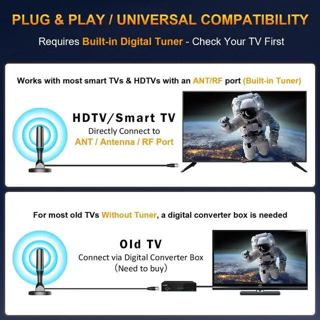 ^^ --: Get up and running in just 2 minutes. This small compact portable indoor antenna for smart tv is easy to move. simply place it on a cabinetplug it inSwitch input to Antenna / Airscan for channels. No tools needed. Enjoy stable Ultra HD pictures for a seamless, cable-free viewing experience anywhere.