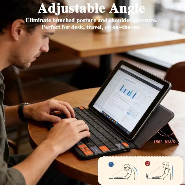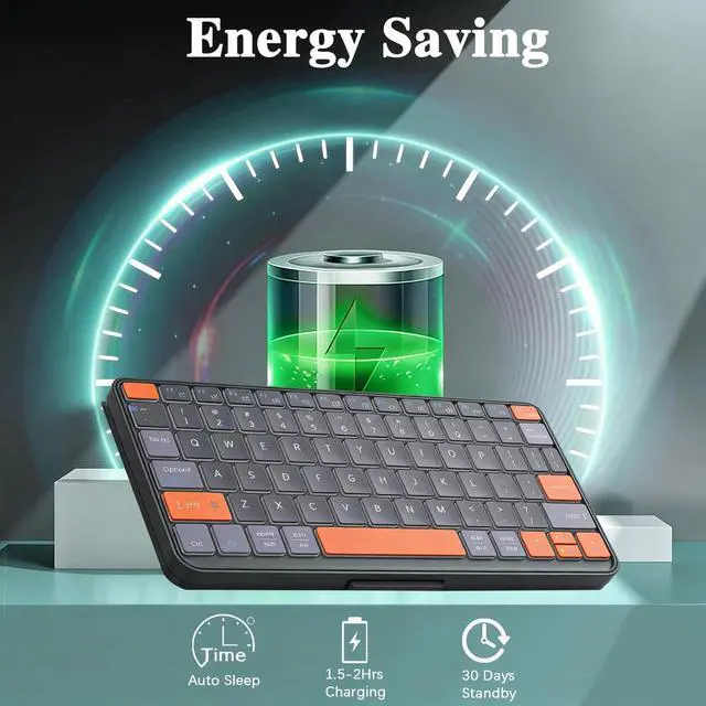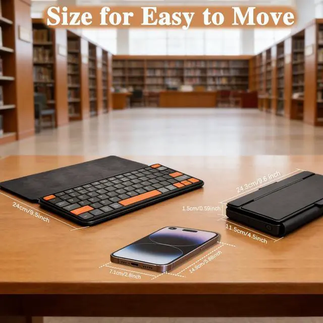 The A16 foldable wireless keyboard is compact ( 24.3 cm 11.5 cm 1.5 cm, 352g) and portable for business trips/commutes. Made of durable ABS+PC with a deep black matte finish, it has an adjustable stand for stable device support. Features include 7-color, 3-level backlit keys (adjustable via Fn+Backlit Key) for low-light visibility, dual-device Bluetooth connectivity (Windows/iOS/Android compatible), and a 300mAh battery offering 120+ days standby after 2-hour Type-C charging, with 60-minute auto-sleep. For connection issues, reset by deleting device Bluetooth history, turning on the keyboard, holding Fn+1 for 3 seconds until the indicator flashes, then reconnecting to "wireless keyboard".