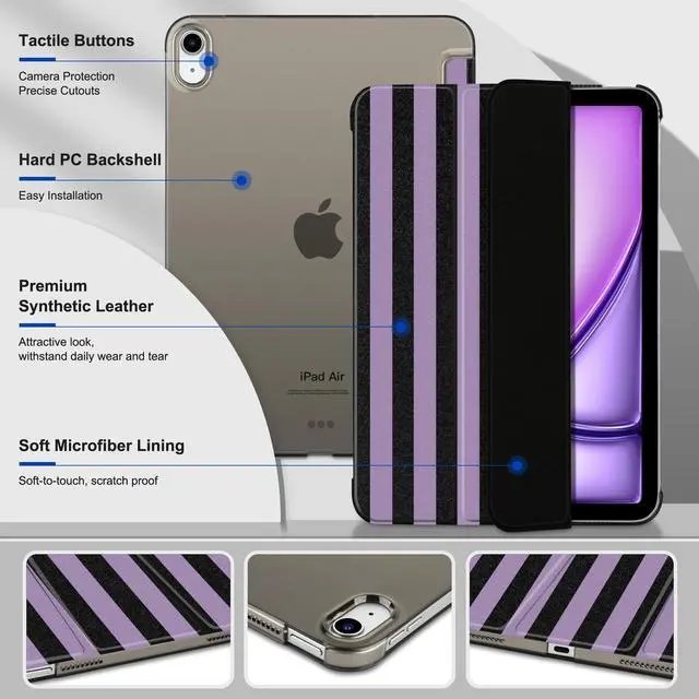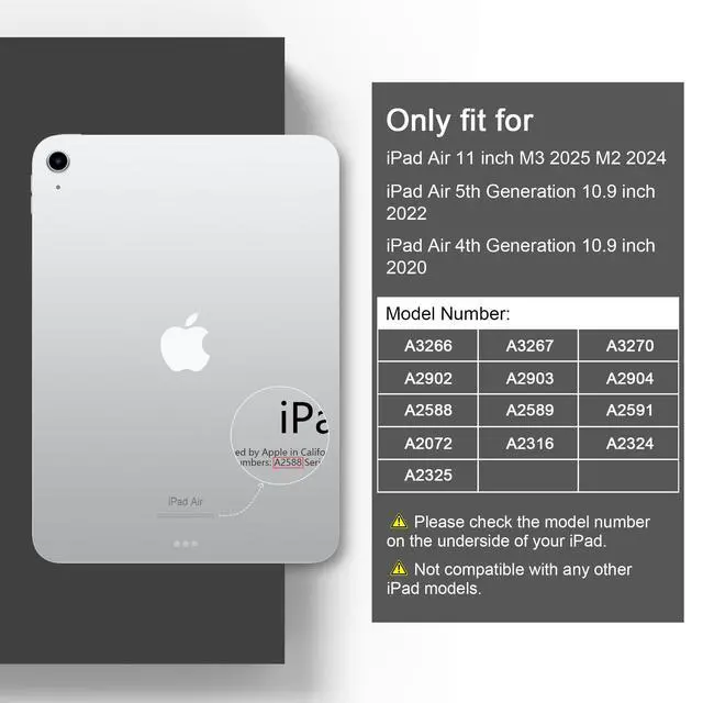 Compatibility Specifically designed for iPad Air 11-inch (M4) 2026 - Model # A3459, A3460, A3463; iPad Air 11-inch (M3) 2025 - Model # A3266, A3267, A3270; iPad Air 11-inch (M2) 2024 - Model # A2902, A2903, A2904; iPad Air 4th & 5th Gen 10.9 -inch (2020 / 2022) - Model # A2588, A2589, A2591, A2316, A2324, A2325, A2072. Not compatible with other iPad models. ^^ Auto Sleep/Wake Function -- Automatically puts your iPad to sleep when closed and wakes it up when opened, saving battery life.