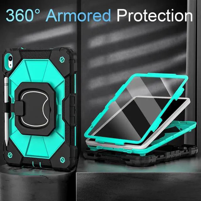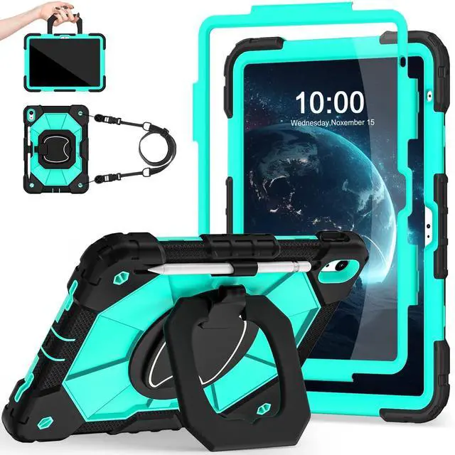 Number: A2696/ A2757/ A2777). Not fit any other iPad! ^^ 360 ROTATING STAND PENCIL HOLDER iPad case 10th generation with a rotating handle that also folds 180 to give you multiple angles between 25-85 degrees of horizontal or vertical orientation, iPad 10.9 case with pencil holder. Also offers hand hold and hung on wall using by handle function, allow you use or carry much easier, perfect for a variety of people and occasions. ^^ MULTIFUNCTIONAL CARRYING STRAP 10.9 inch ipad case 10th generation with adjustable shoulder strap will allow you to display your iPad behind car head rest or hang it anywhere for your better entertainment, make your hands free. Perfect for traveling, outdoor activities. ^^ PREMIUM PROTECTION This iPad 10th case is made of shockproof PC & soft silicone(with built-in screen protector), so nice to touch, provides a better grip. Unique shock-proof design keeps your iPad better protected to avoid daily bumps, scrapes, defeat 99% accidental drops, unbreakable! ^^ PRECISE CUTOUTS All controls to easily access all iPad functions without taking your apple ipad 10th generation out of the case.