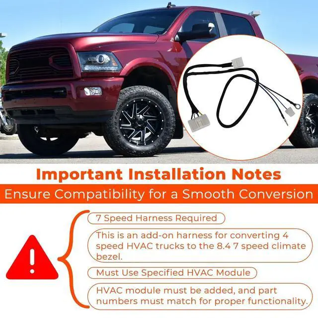 Notice 1:You must purchase the 7 speed harness as well in order for this harness to work. This is the add on harness when you are converting a 4 speed HVAC truck to the 8.4 7 speed climate bezel.