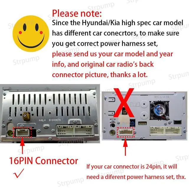 ^^ Please note: Only fit for aftermarket radio with 16pin power socket like shown in description. Can not fit for Pioneer/Sony/Keenwood radios. For compatibility issue, please check the original car connector picture to make sure you ordered correct harness, the small white connector is a 16pin connector, for higher spec model it is a 24pin connector, please know it. ^^ Plug and Play to factory car connectors, no need to cut original car harness. For sound issue, first, please check the wiring, the red and white audio plug connect to your radio's RCA audio plug, besides, there is a wire labeled''AMP'', please connect to the RED ACC wire, thanks. ^^ The higher spec model with a 24pin original camera connetor radio harness