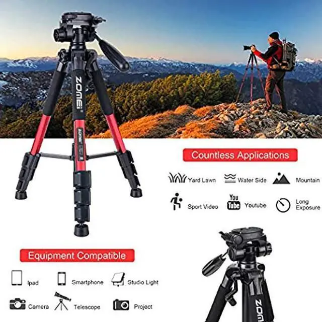 Made of high quality aluminum alloy tube and ABS environmental plastic. Weighs just 2.6 lbs, Lightweight and portable. And equipped with a carrying bag that makes it easier for you to travel. ^^ Lightweight tripod with adjustable-height legs and rubber feet, 4-section column leg with quick release locks provides a more convenient stance satisfying your desired height when shooting. 3-Way Swivel Pan Head, with a Arca Swiss compatible clamp, easily to put on and off. And can work for most of cameras. ^^ A precision bubble level. Design includes three (3) adjustment knobs to dampen ball head effect, when applicable, with abilities to shoot at any angle with precision and efficiency.